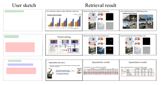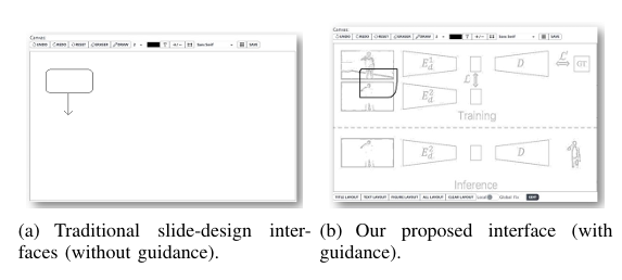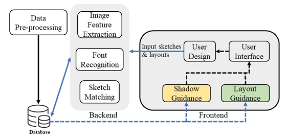DualSlide provides both global and local design stages for slide design. The proposed system consists of three parts: a preprocessing procedure for slide extraction; a database, which contains slide layout features and diagrams extracted from each slide, and a user interface (see Fig. 2). To construct the database, we first extracted slides from academic conference presentation videos. We then used a layout parser to analyze and label the layout of each slide. After that, we used a convolutional neural network (CNN) to extract the features of the labeled slides and store them in the database. Additionally, we trained another neural network to recognize the font in the slides, and we improve the image similarity algorithm to implement the slide retrieval function. The user interface has three sections: the sketch canvas for user editing, the heat map canvas for design guidance, and the results section for displaying similar slides.