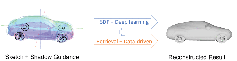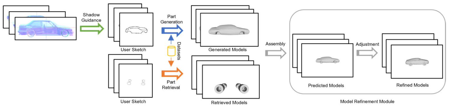 In this work, we propose DualShape, a hybrid 3D shape design framework based on the sketch. As shown in Fig, our framework is mainly composed of four modules: the part retrieval module; the part generation module; the part assembly module and the model refinement module.