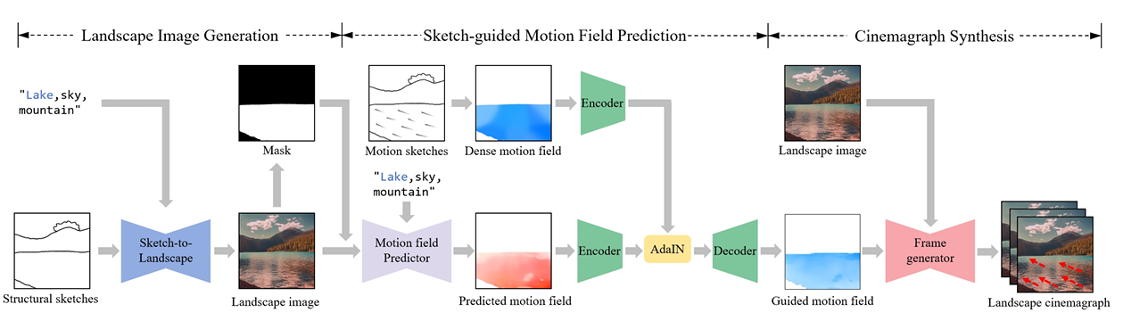 Fig. 1 illustrates the proposed framework for cinemagraph synthesis using sketch guidance. First, the landscape image generation step adopts latent diffusion model (LDM) to generate a realistic landscape image from structural sketch and text. However, the baseline LDM model has limitations in accurately generating naturalistic outdoor scenery due to an adequate quantity of high-quality landscape images in training data (Fig. 2 b). Therefore, we conduct the fine-tuning of LDM model on a real landscape dataset [Holynski et al. 2021]. Then, the pre-trained ControlNet is adopted to control the spatial regions and contents during the image generation process. To generate dynamic fluid elements while keeping background still, we extract the fluid mask from the generated image using the Grounded-SAM method Ren et al. 2024.