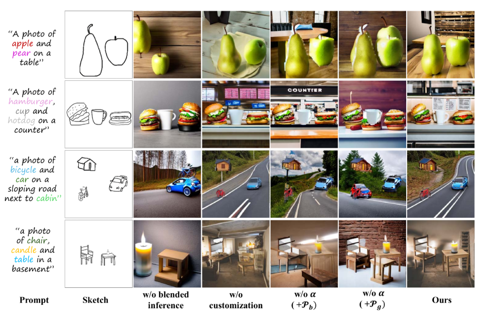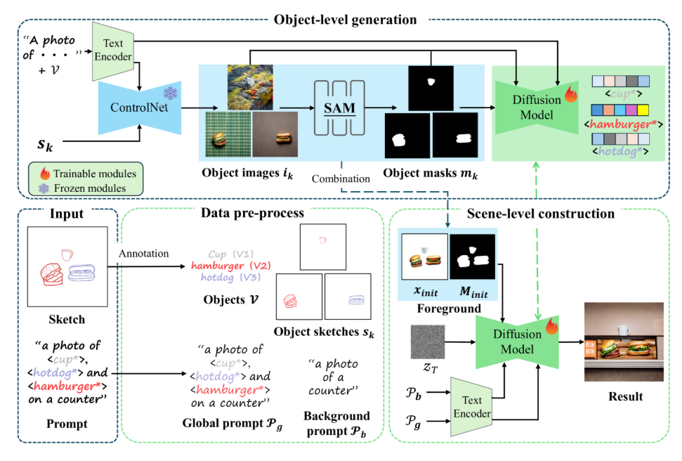 In this work, we propose the sketch-guided scene image framework based on the text-to-image diffusion model. As shown in Figure 1, to construct images across domains while maintaining the spatial distribution of the original scene sketch, we decouple the generation of foreground and background, breaking the image generation task into two subtasks: object-level cross-domain generation and scene-level image construction. In the object-level cross-domain generation, we utilize ControlNet to generate corresponding images from independent sketch objects, effectively preserving the shape of sketches and enriching the details. To address style conflicts in objects images and maintain consistent visual features in scene generation, we customize the detailed visual features of the generated objects with special identity tokens. Specifically, we use masks for the corresponding areas to ensure the model focuses only on pixels related to the objects while ignoring background influences. In the scene-level image construction, we guide the latent representation with foregrounds by combining the foreground images and masks. We first generate the background using a background prompt, and directly blend the foreground and background in the latent space. After determining the spatial distribution, we infer the entire image with global prompts containing special identity tokens. This process bridges the separation caused by previous blending and naturally fuses the foreground and background.